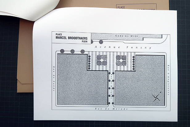 Place Marcel Broodthaers Plein, Bruxelles, Les Éts. Decoux, 2024, (30 p.), 21,5 x 27,5 cm, impression laser N/B, sous chemise cartonnée, 30 ex. num., une carte postale jointe.